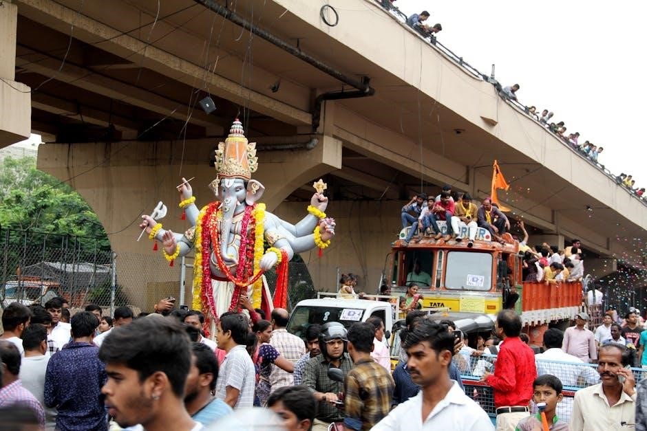 The idol is carefully carried in a vibrant procession, accompanied by music, dancing, and chants of “Ganpati Bappa Morya!” Families often revisit the stories from the Katha, reflecting on Lord Ganesha’s journey and lessons. Accessing the Telugu PDF version allows for a deeper understanding of the symbolism.